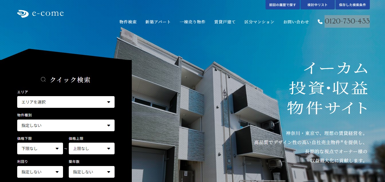 イーカムは、神奈川・東京に展開する不動産会社です。不動産投資事業を展開しており、木造2〜3階建ての投資用アパートをはじめとして、鉄筋コンクリート造・鉄骨造の賃貸マンション、収益ビル、賃貸戸建、区分マンションなど、幅広い投資・収益物件を取り揃えています。立地や建物の品質にこだわった物件を多数展開していることから、安定した家賃収入が見込めます。
