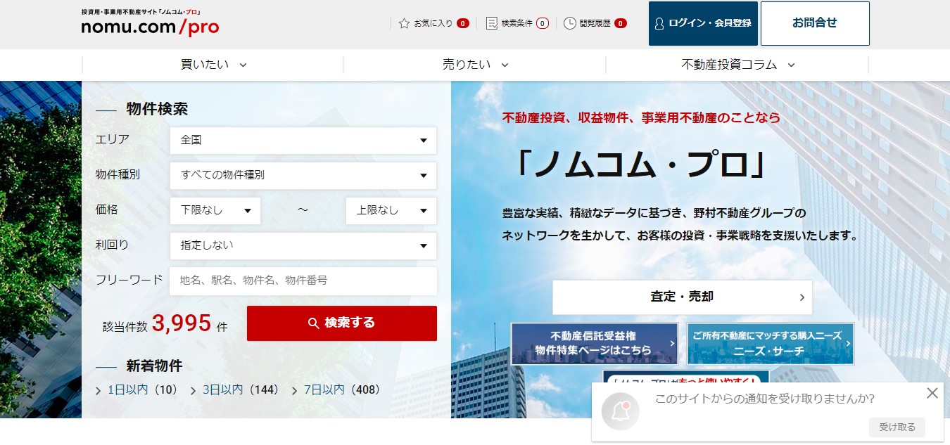 ノムコムプロは、区分マンションや一棟アパート、ビル、土地など、多彩な投資用・事業用不動産の情報を取り扱っています。2025年5月現在、全国にある3,900件を超える不動産情報が掲載されています。